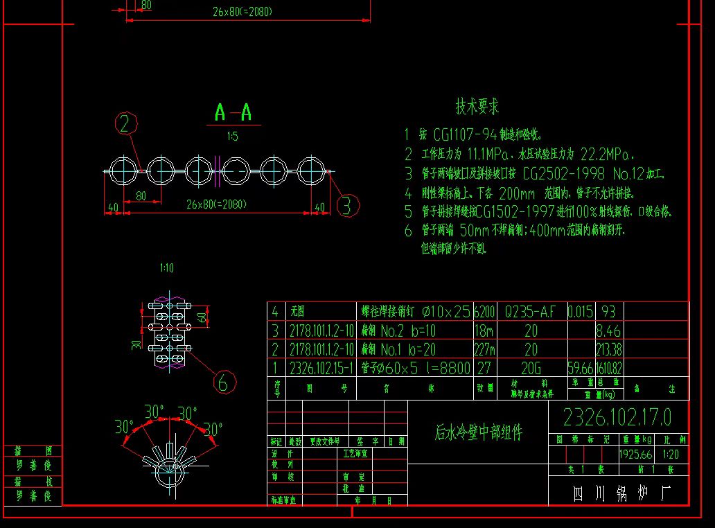 水冷壁管排要求:每根长度9米,10根为一排,每根管子往上1.5米-3.5米之间焊接销钉(销钉材质为20G),两侧带鳍片,合计220根管子。销钉合计22000个,每根上面100个。焊接要求见图纸。