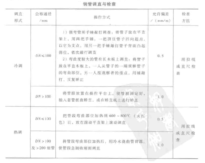钢管安装后使用中被撞弯、压扁;在运输、装卸、堆放过程中产生弯曲,特别是规格较小的低压流体输送用焊接钢管,更容易产生弯曲。为了保证钢管正常使用,应对钢管进行调直。弯曲度允许偏差和检查方法见下表。