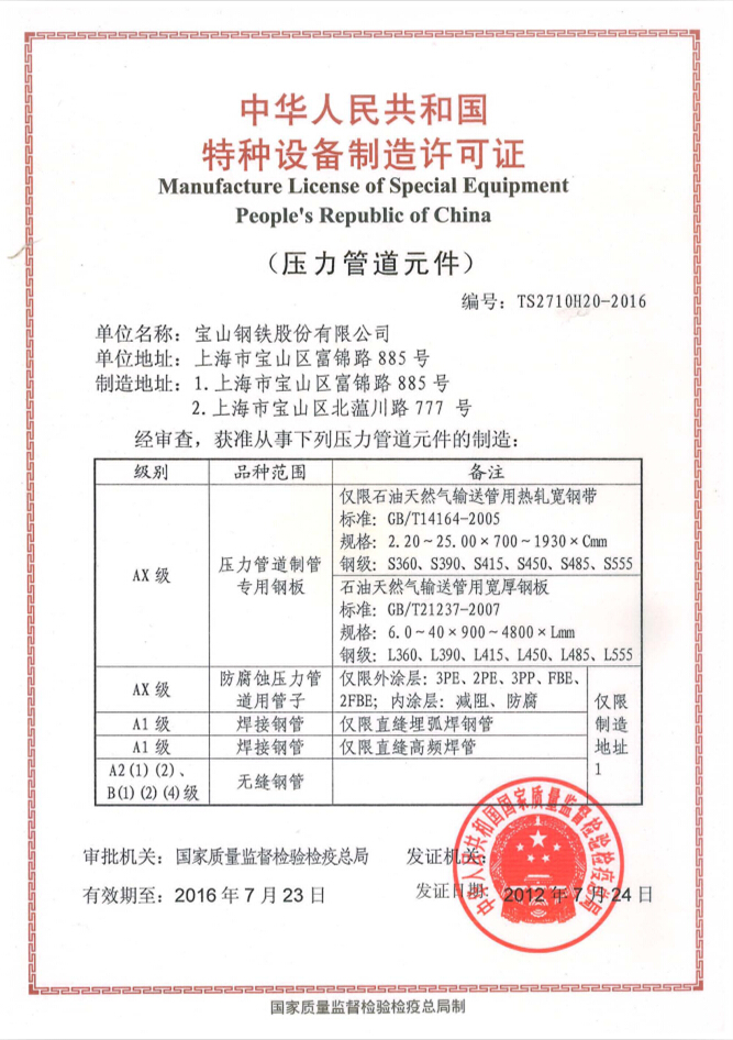 关于无缝钢管的压力管道元件制造许可项目及其级别表